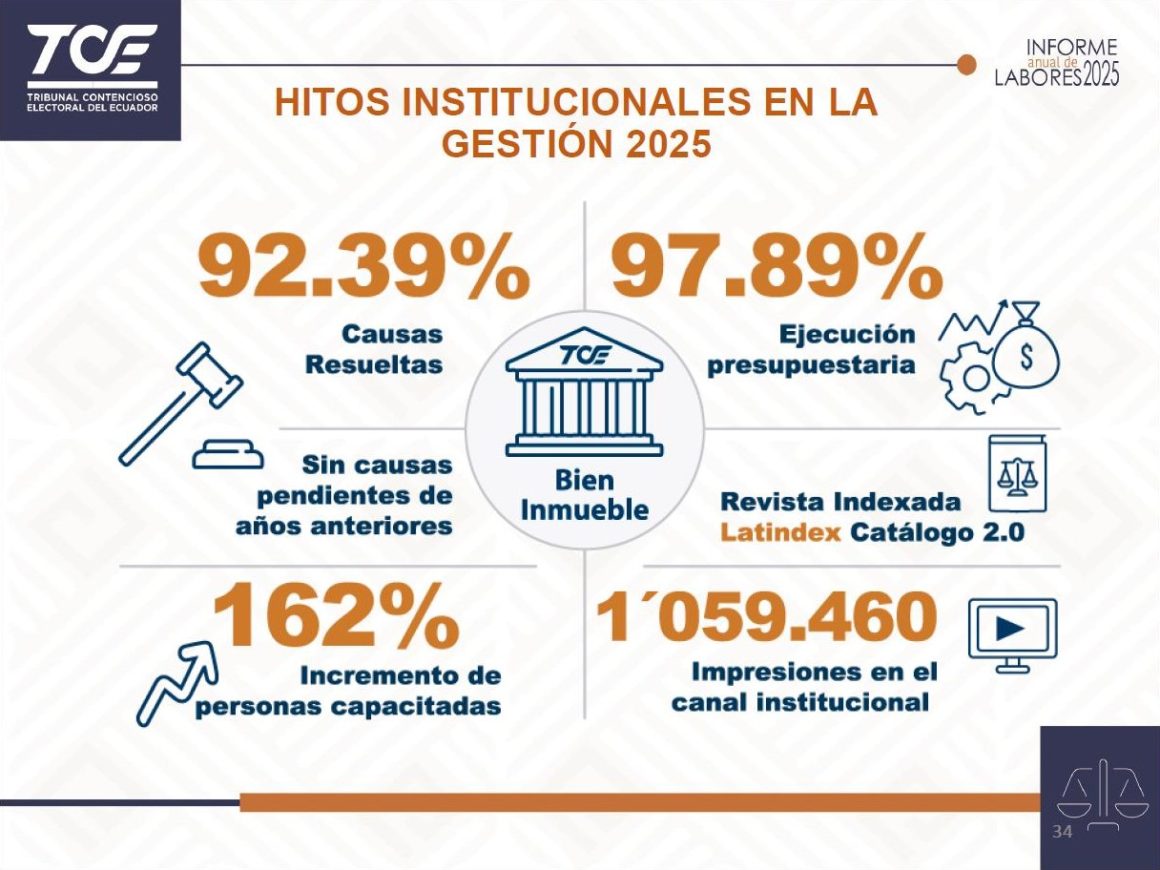 En el ámbito jurisdiccional, durante 2025 el TCE conoció 618 causas y resolvió el 92,39 %, cerrando el período sin causas pendientes de años anteriores, lo que permitió eliminar el rezago judicial y asegurar la tutela efectiva de los derechos políticos. En materia de violencia política de género, el Tribunal conoció 23 causas, de las cuales 18 fueron resueltas y 5 están en trámite, fortaleciendo además los protocolos de confidencialidad y las acciones de capacitación.